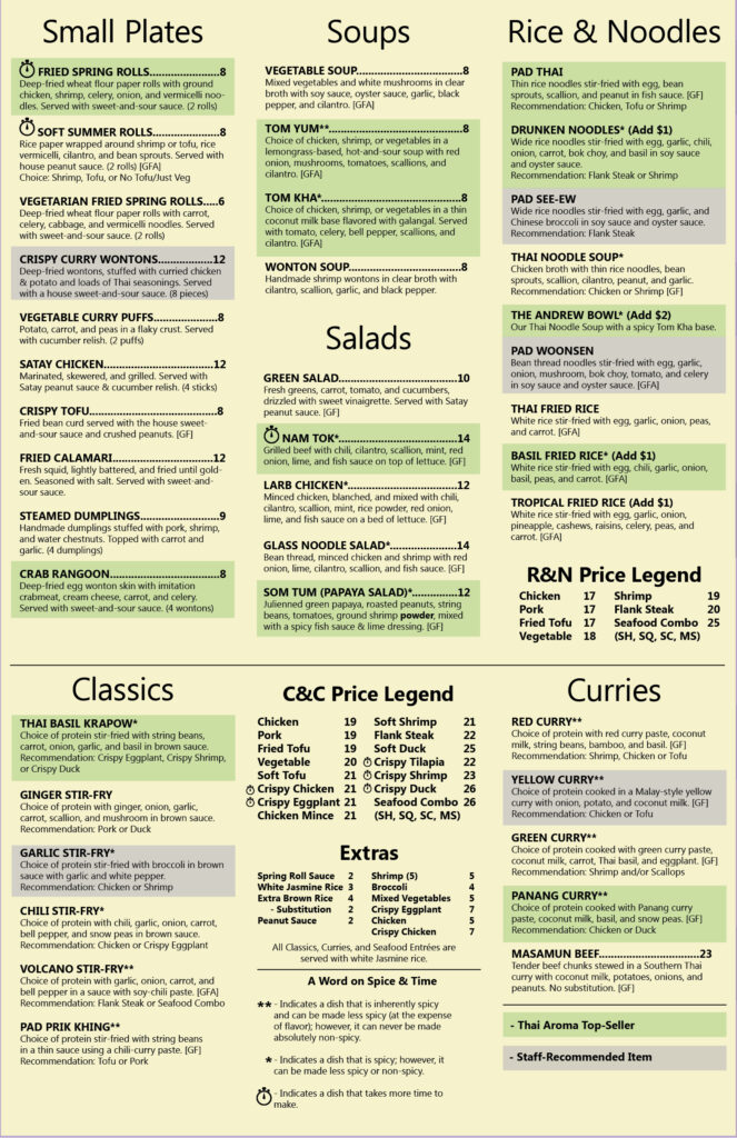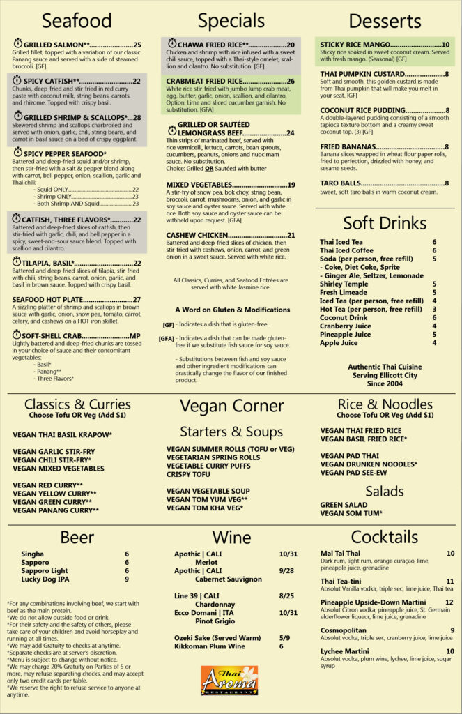 Thai Aroma is known for its family-friendly atmosphere and warm service in a neighborhood restaurant.